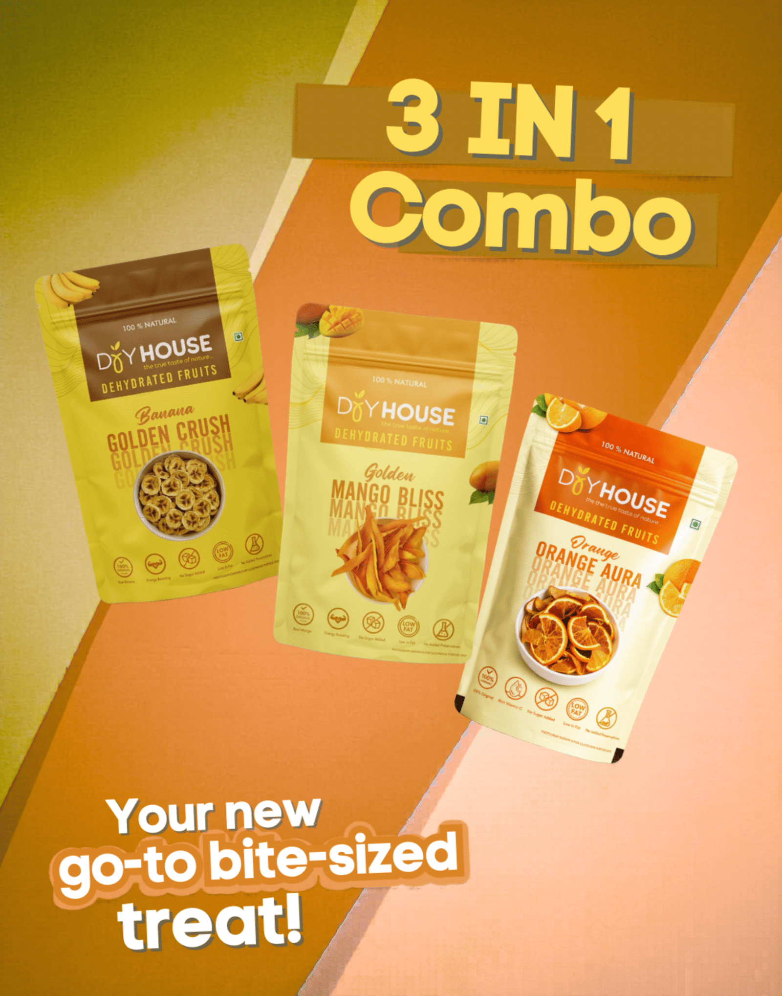 Dry House Dehydrated Banana + Orange + Mango Slices | No Added Sugar | Healthy Snack | Made from Real Banana + Orange + Mango | 40g